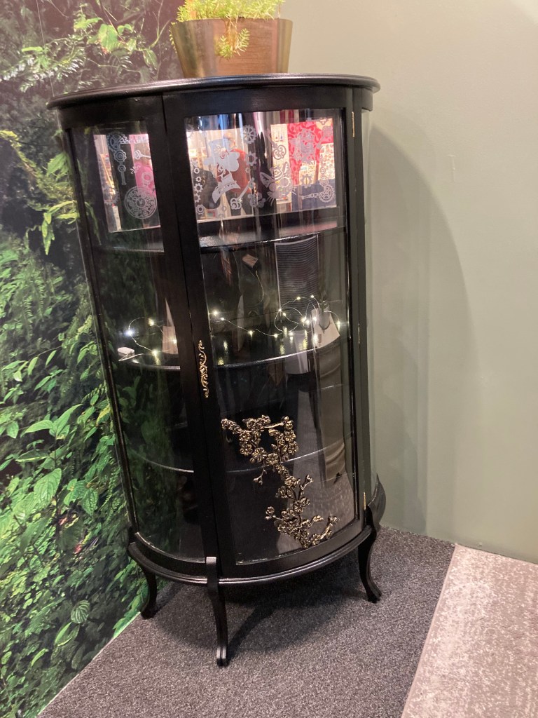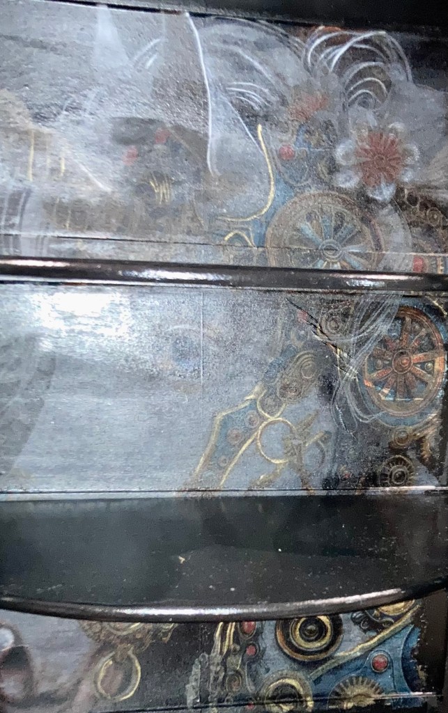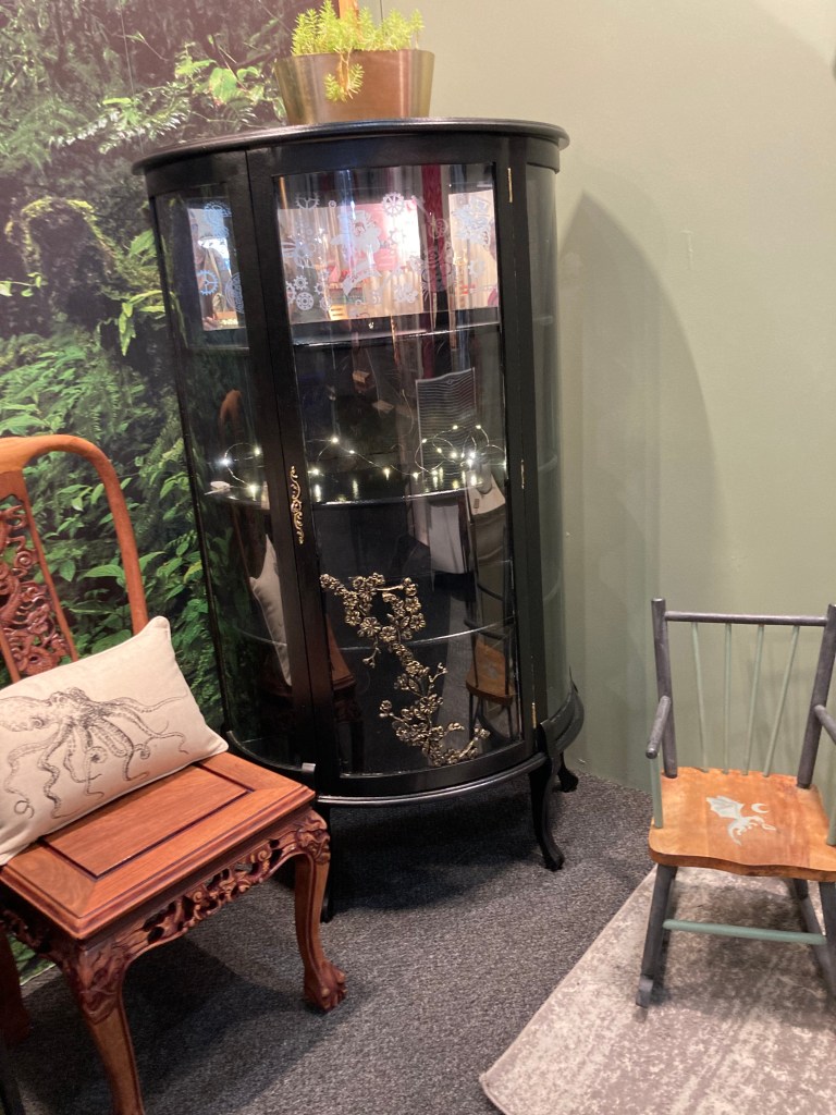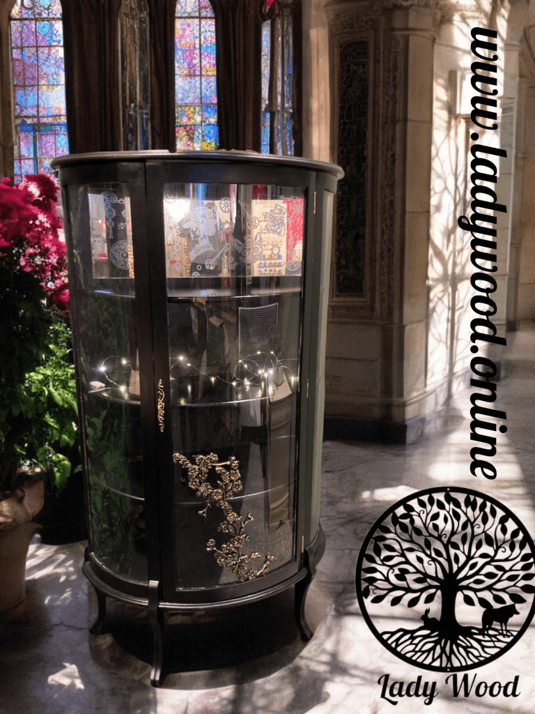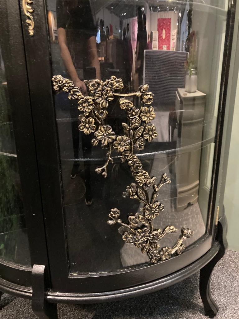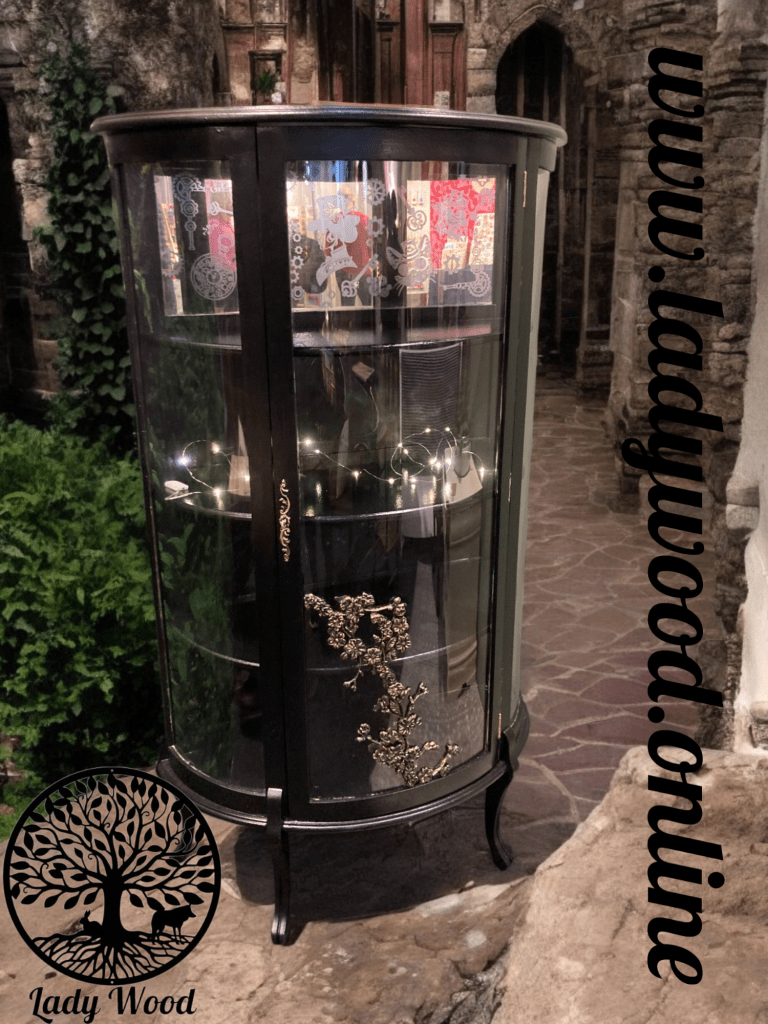 This 1940s glass display cabinet has been transformed with a steampunk edge. Gold cherry blossoms creep across the glass door, framing a gold-leaf keyhole that hints at secrets within. Inside, a shadowy unicorn with gilded highlights stands guard, reflected in a mirrored back etched with steampunk designs. Painted in deep black, this piece exudes mystery, inviting you to hide your treasures in plain sight.