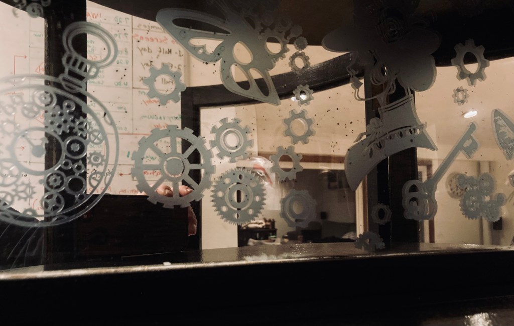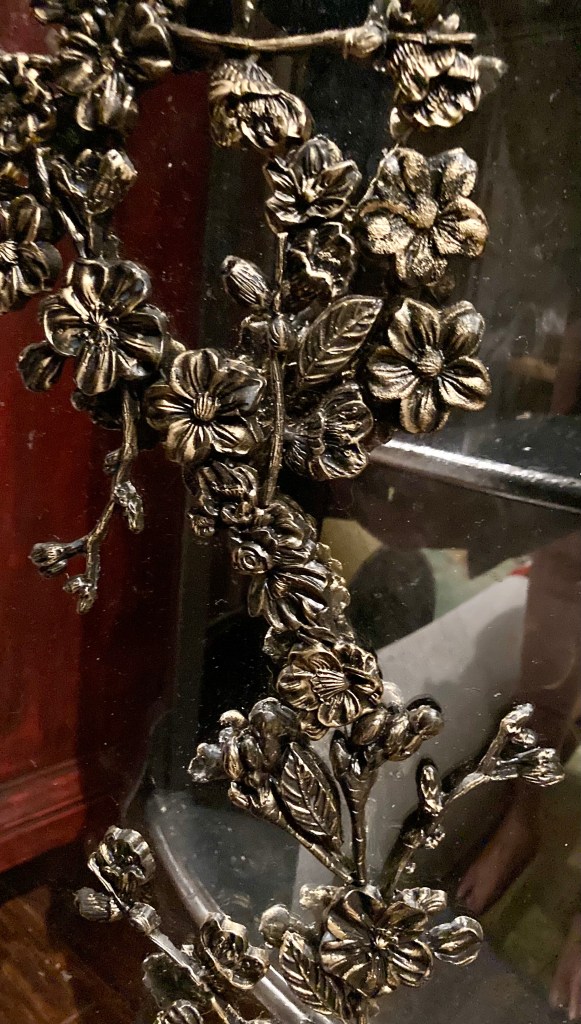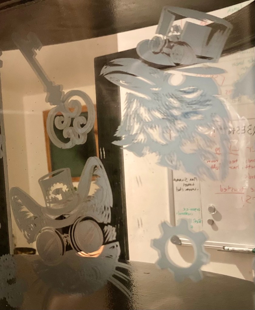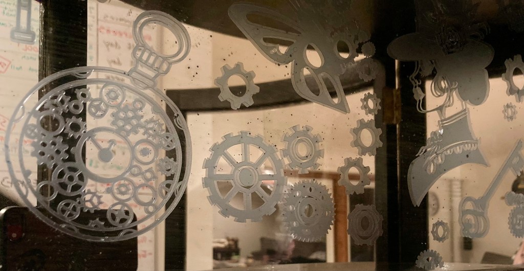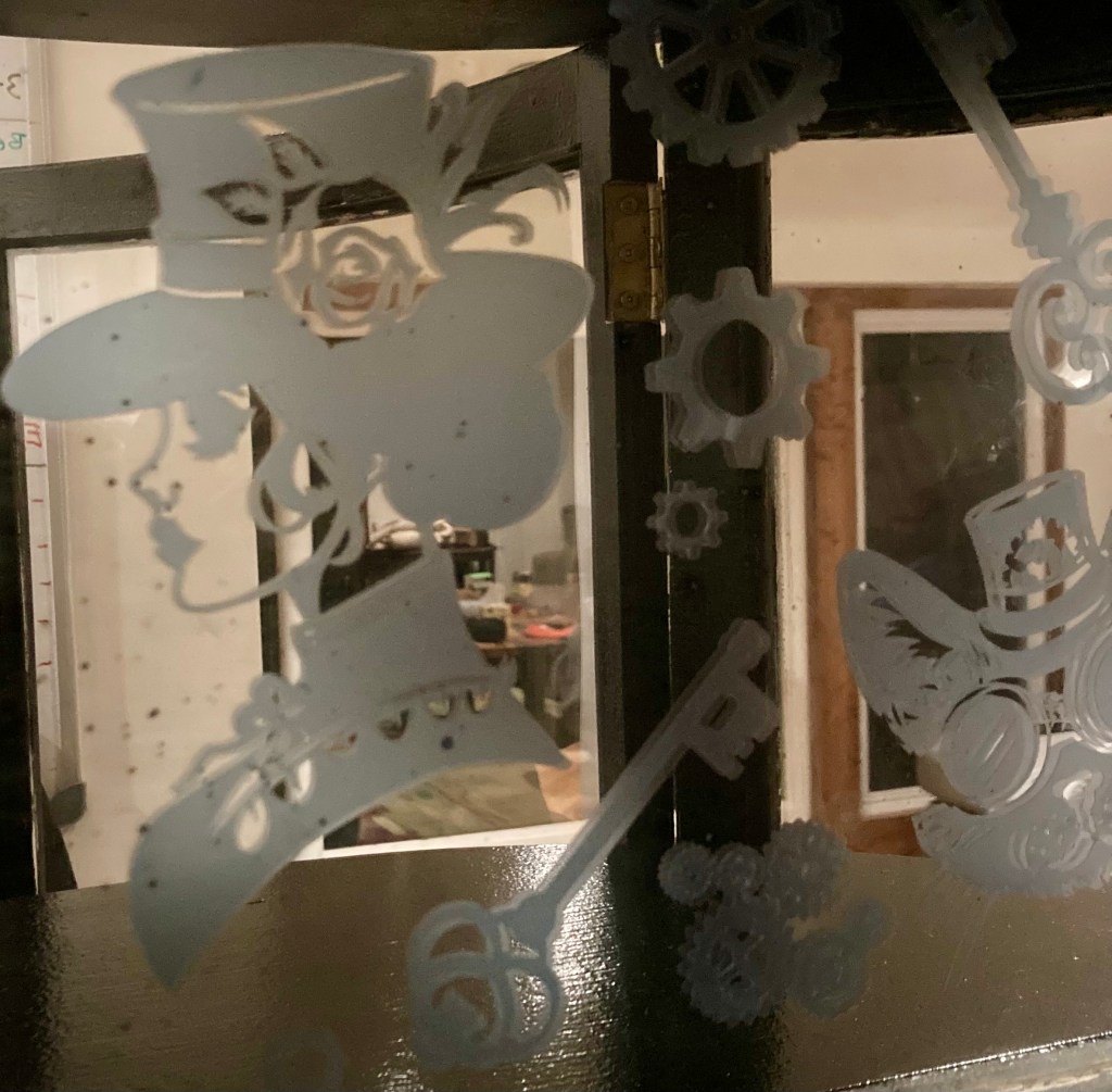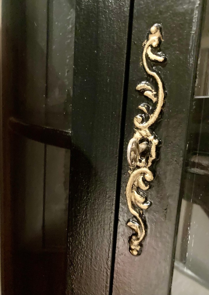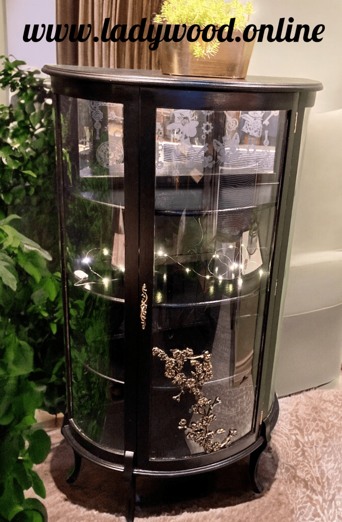 This 1940s glass display cabinet has been transformed with a steampunk edge. Gold cherry blossoms creep across the glass door, framing a gold-leaf keyhole that hints at secrets within. Inside, a shadowy unicorn with gilded highlights stands guard, reflected in a mirrored back etched with steampunk designs. Painted in deep black, this piece exudes mystery, inviting you to hide your treasures in plain sight.