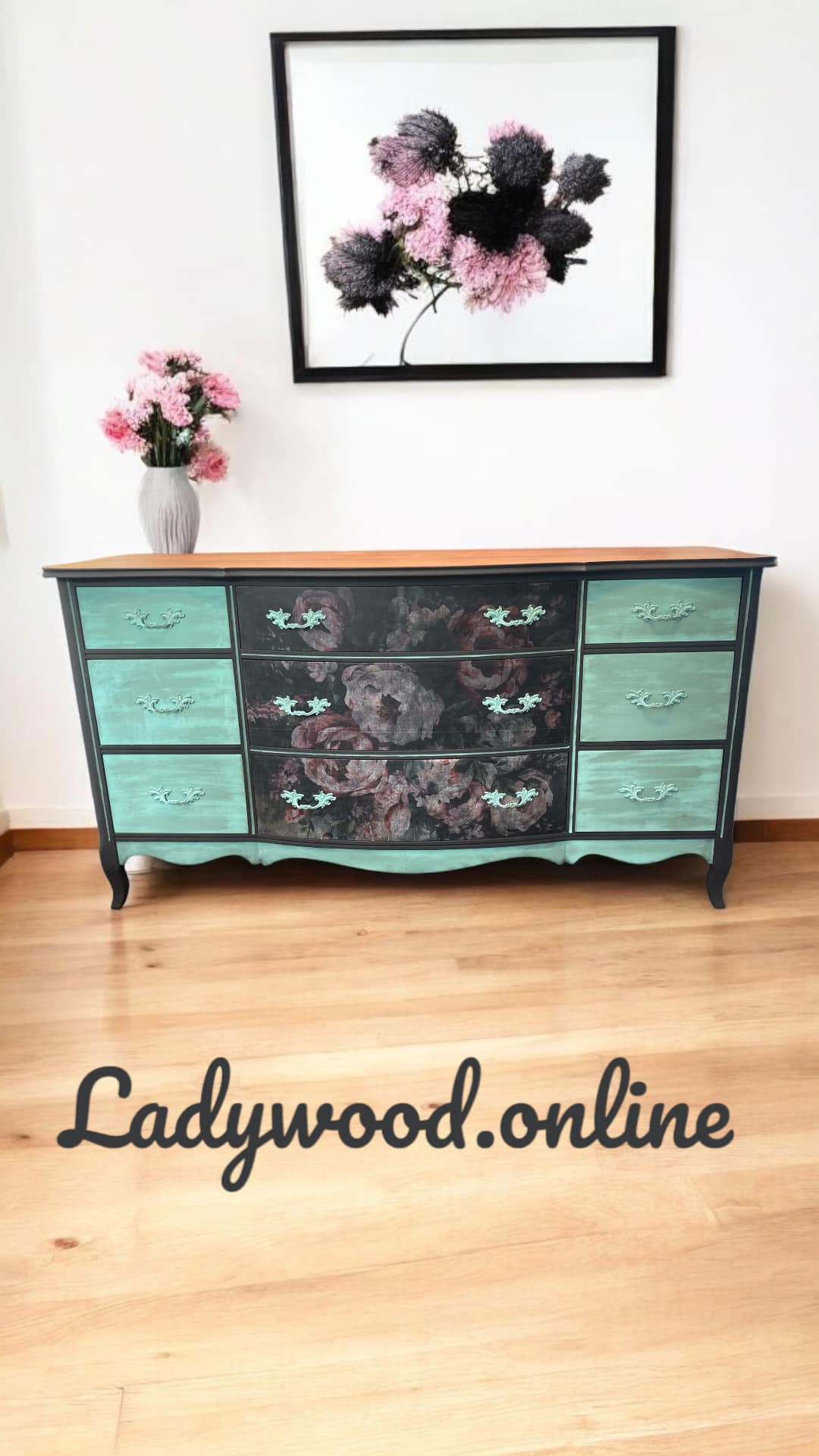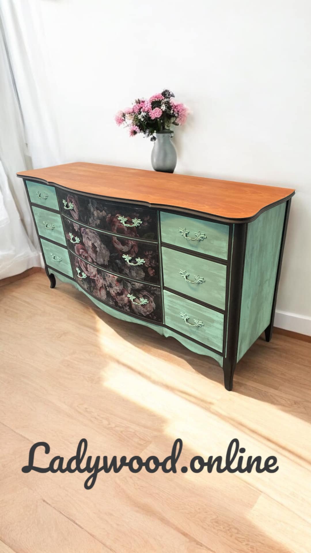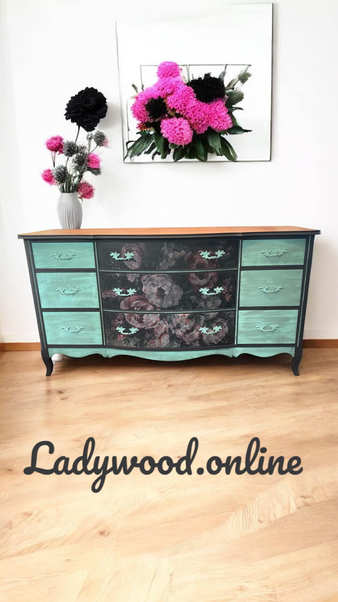 Teal and black wax. Flourished hardware because “Why not?”. The drawers? Black and pink florals—because sometimes it’s necessary. The top? Natural wood, left to breathe. French Provincial that doesn’t play by provincial rules—or want to be destined for a provincial life.