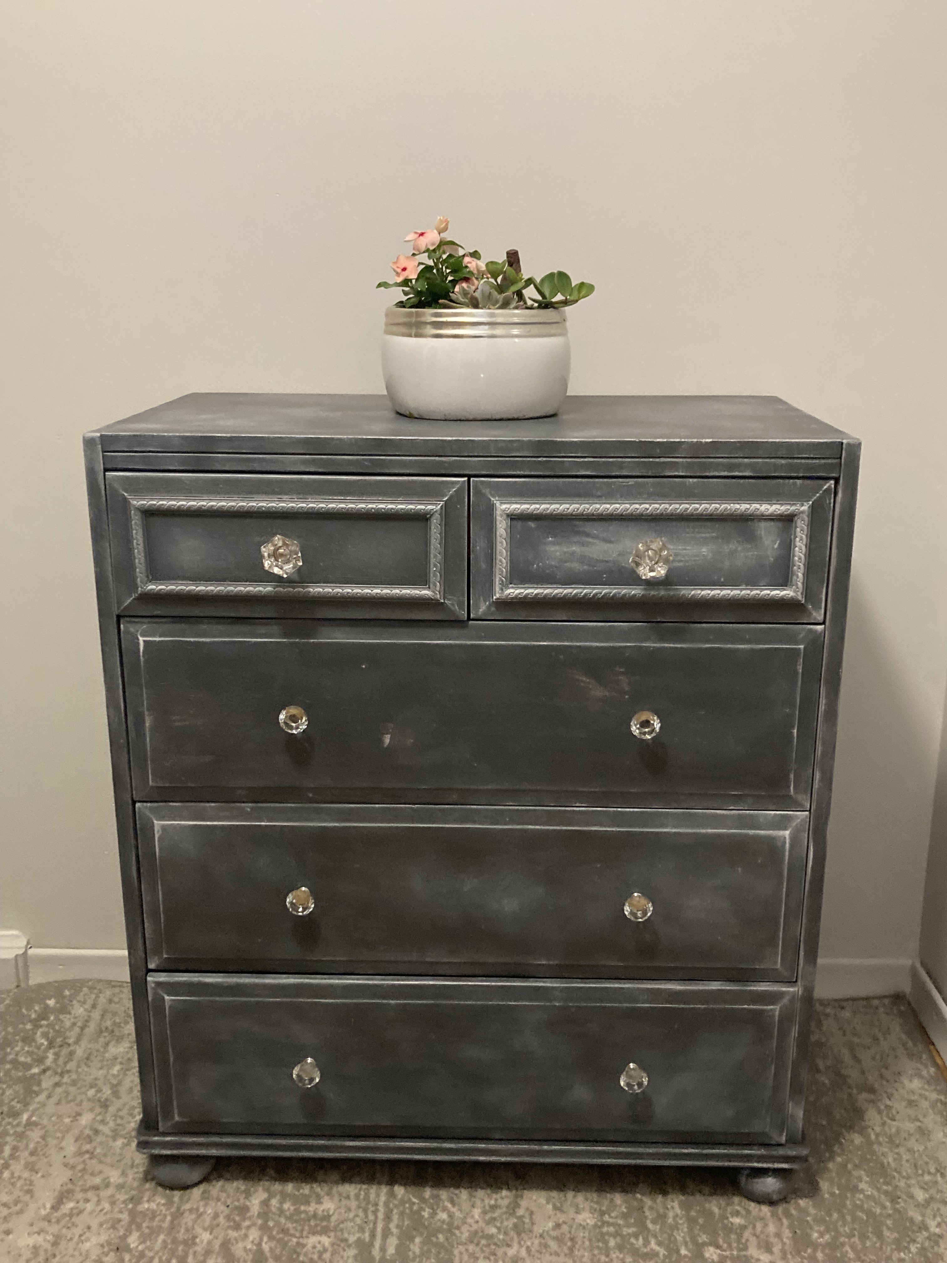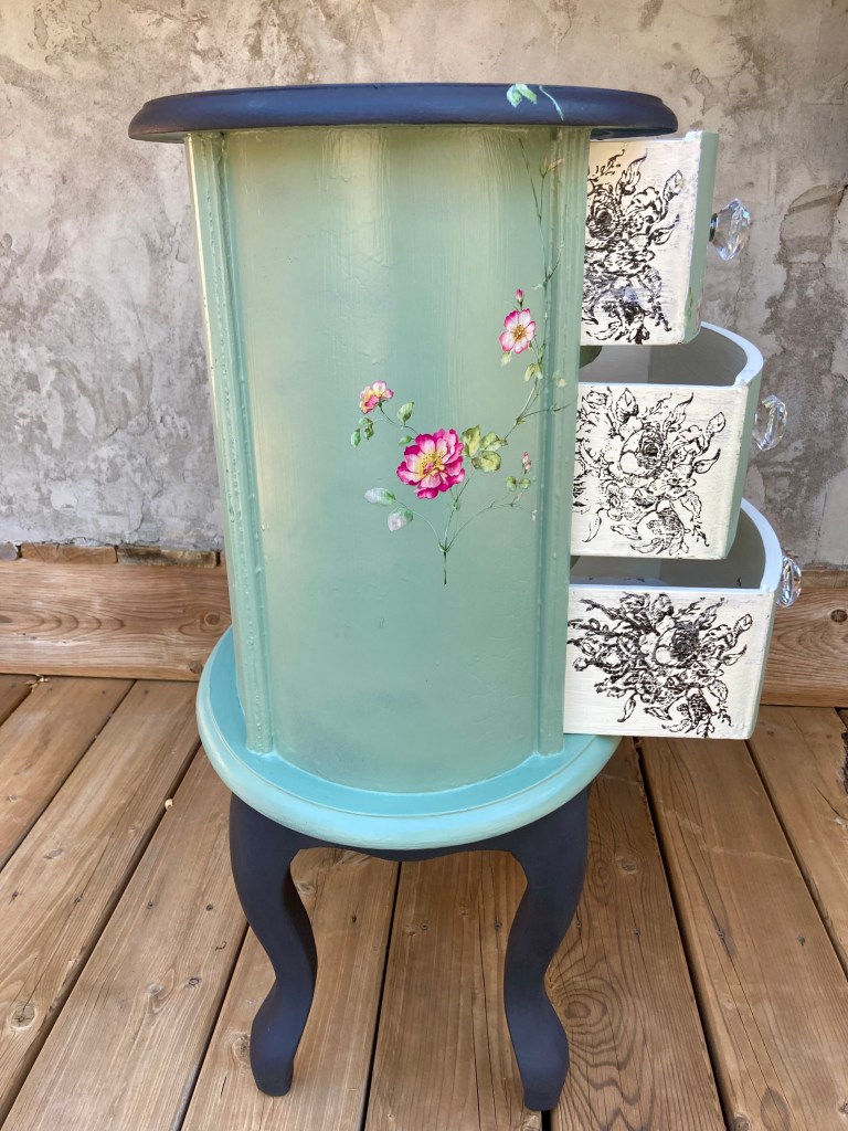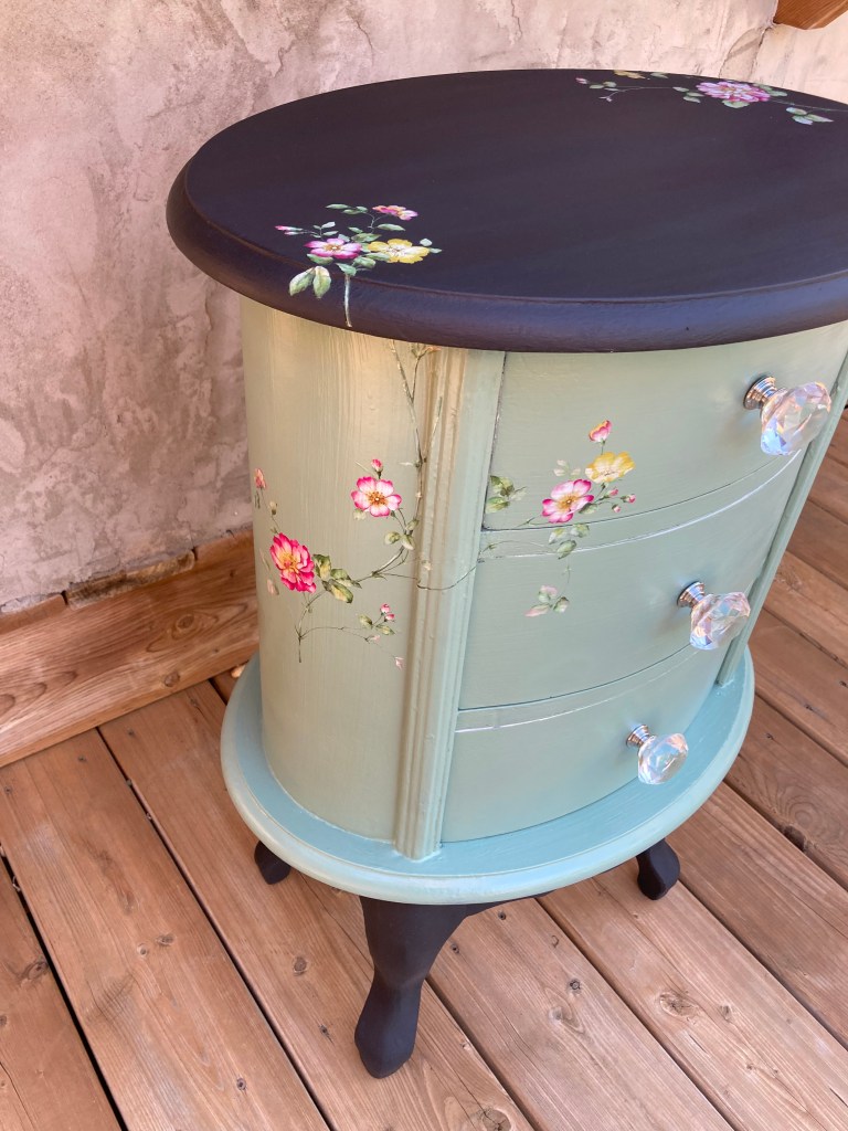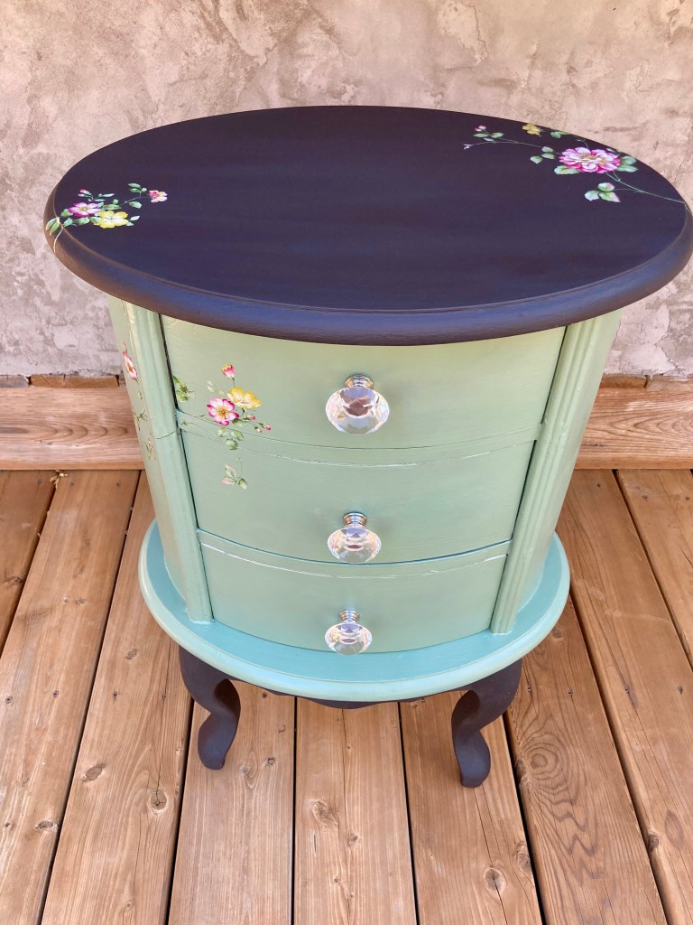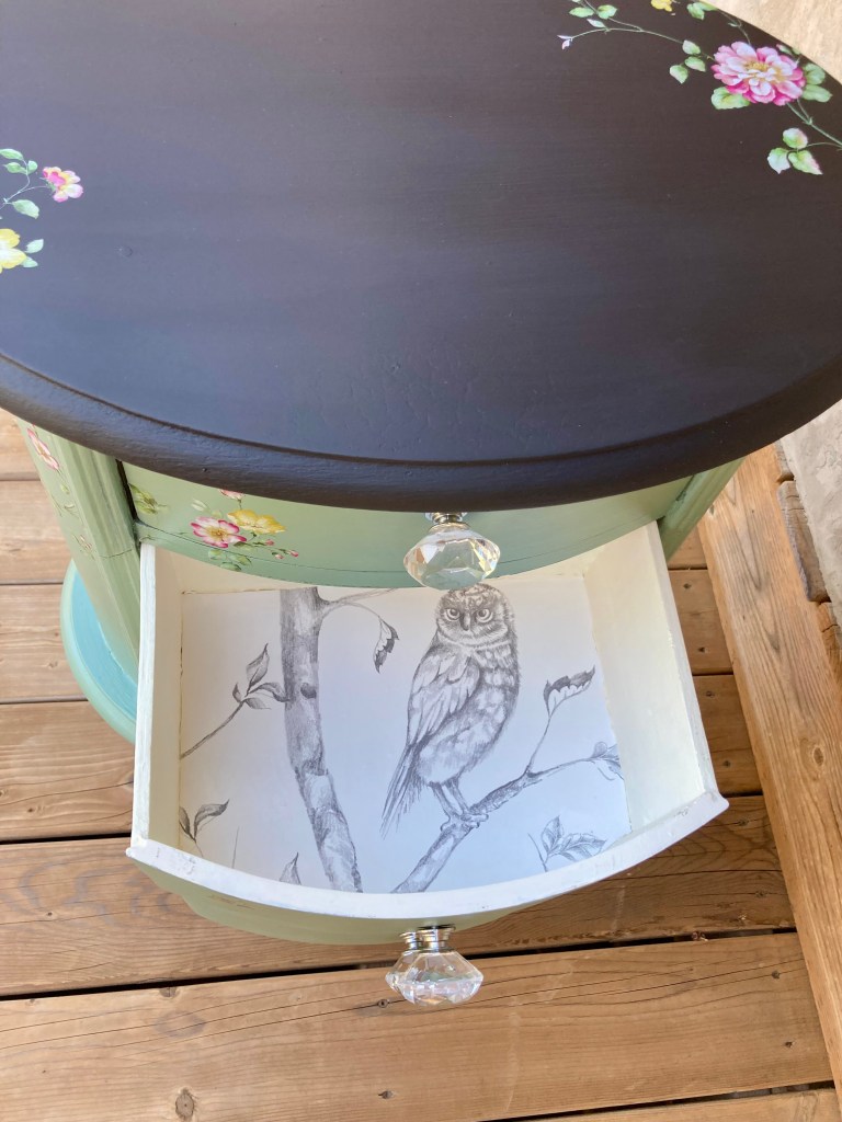 Teal and black wax. Flourished hardware because “Why not?”. The drawers? Black and pink florals—because sometimes it’s necessary. The top? Natural wood, left to breathe. French Provincial that doesn’t play by provincial rules—or want to be destined for a provincial life.