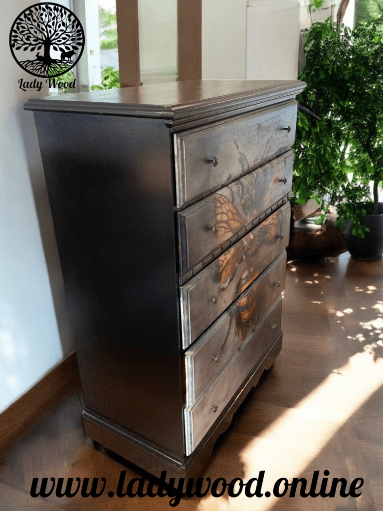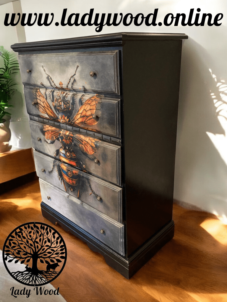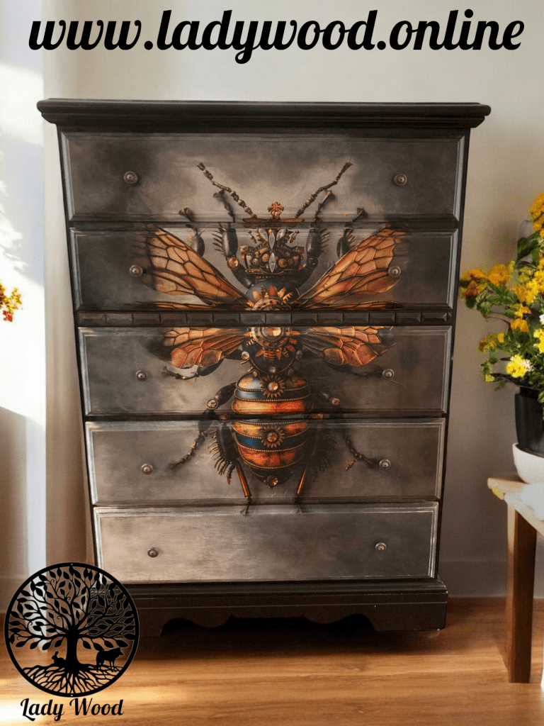 Lady Wood’s 5-drawer stunner blends functionality with regal sophistication. Cloaked in a sleek, glossy black finish, this dresser commands attention. At its heart, a majestic queen bee motif symbolizes strength, elegance, and nature’s divine order.