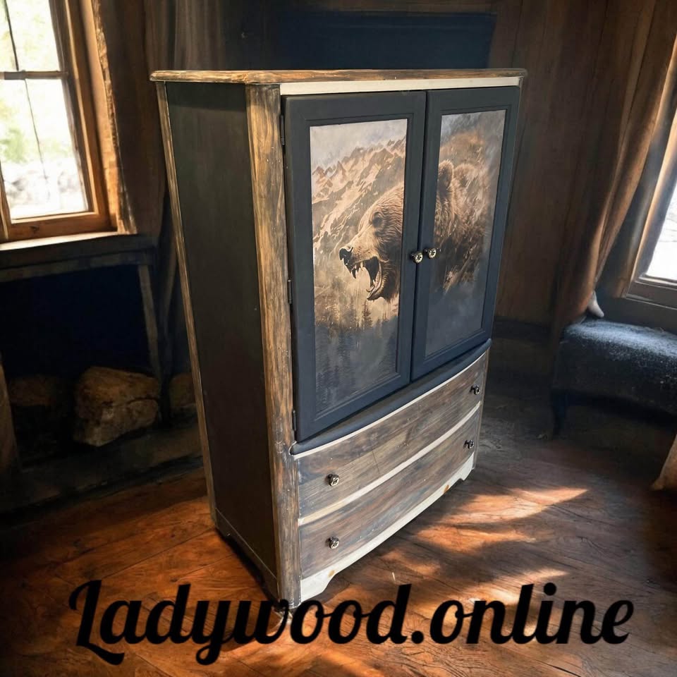 Matte black accents provide a sleek, modern contrast, while a striking image of a grizzly bear on the front adds a touch of wild elegance. Finished with custom enamel bear drawer pulls, this armoire perfectly balances rugged character with refined craftsmanship.