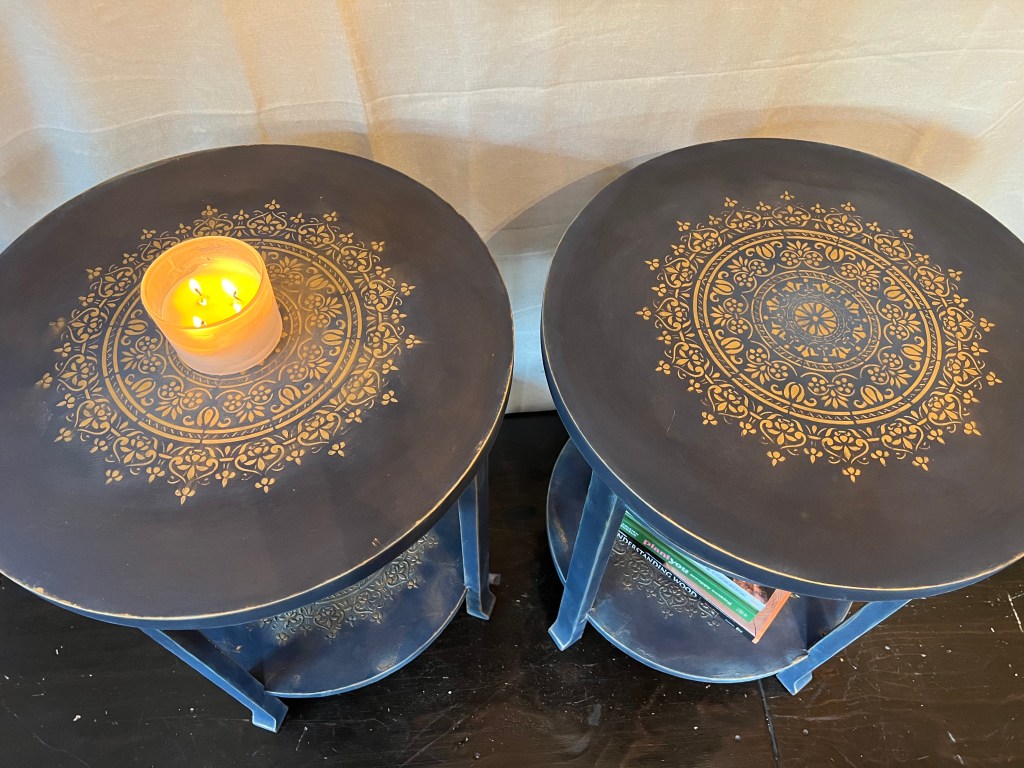 The table tops feature a flat mandala design, delicately dry-brushed with gold to catch the light and highlight the intricate patterning. The lower shelves mirror this artistry with a raised mandala stencil, offering texture and depth that balance the smooth top.