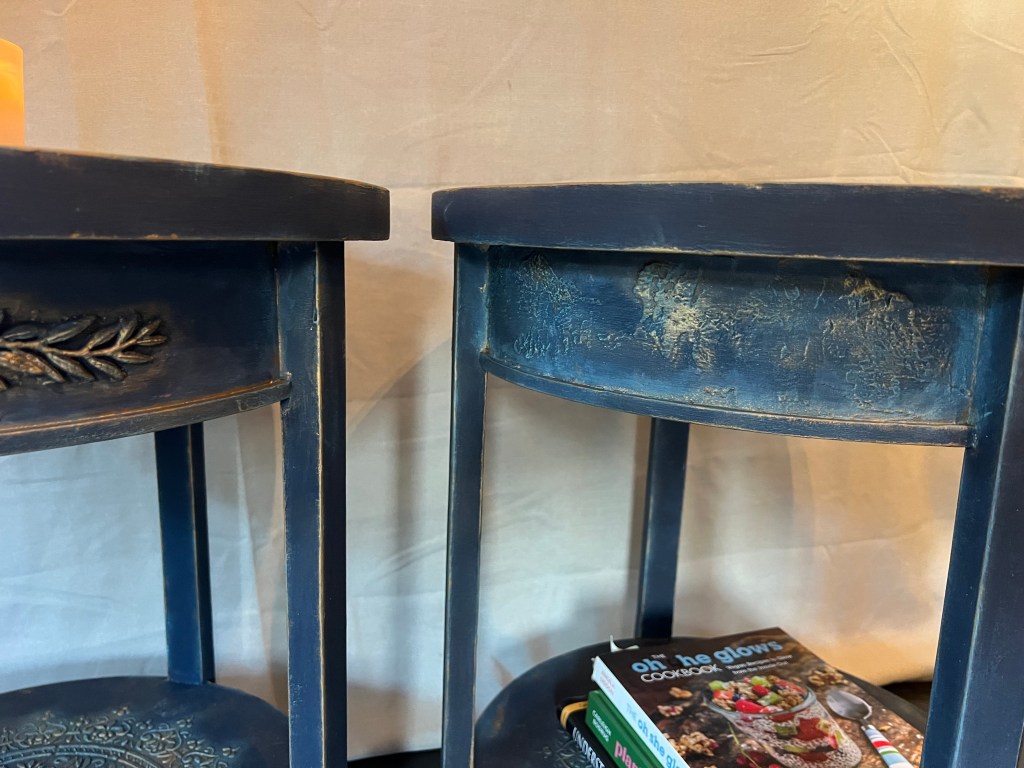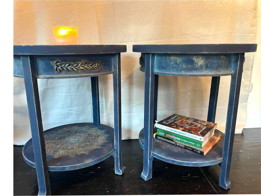 This pair of elegant end tables brings a calm, meditative presence to any space. Finished in layered tones of blue — from a soft sky center that deepens toward the edges — each piece is designed to draw the eye and invite touch.
