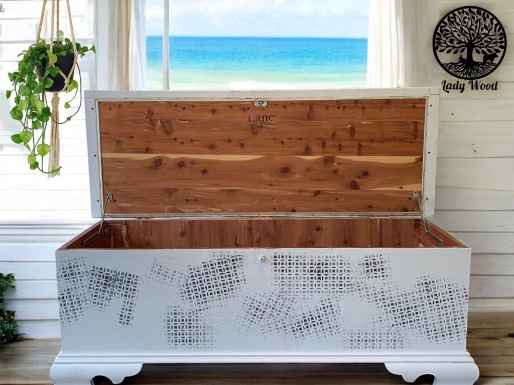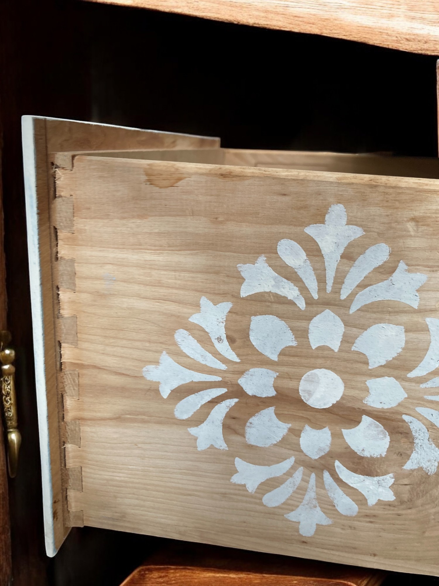 Each drawer is meticulously crafted with dovetail joints, ensuring both structural integrity and a luxurious tactile feel, while the linen-white finish brings a subtle elegance to the piece, providing a perfect contrast to the rich, unadorned wood. What truly sets this dresser apart, however, are the intricate damask linen stencils gracing the sides of the upper drawers, adding a delicate, almost ethereal touch to the overall design. This decorative flourish gives the piece an air of refined artistry, blending both simplicity and sophistication.