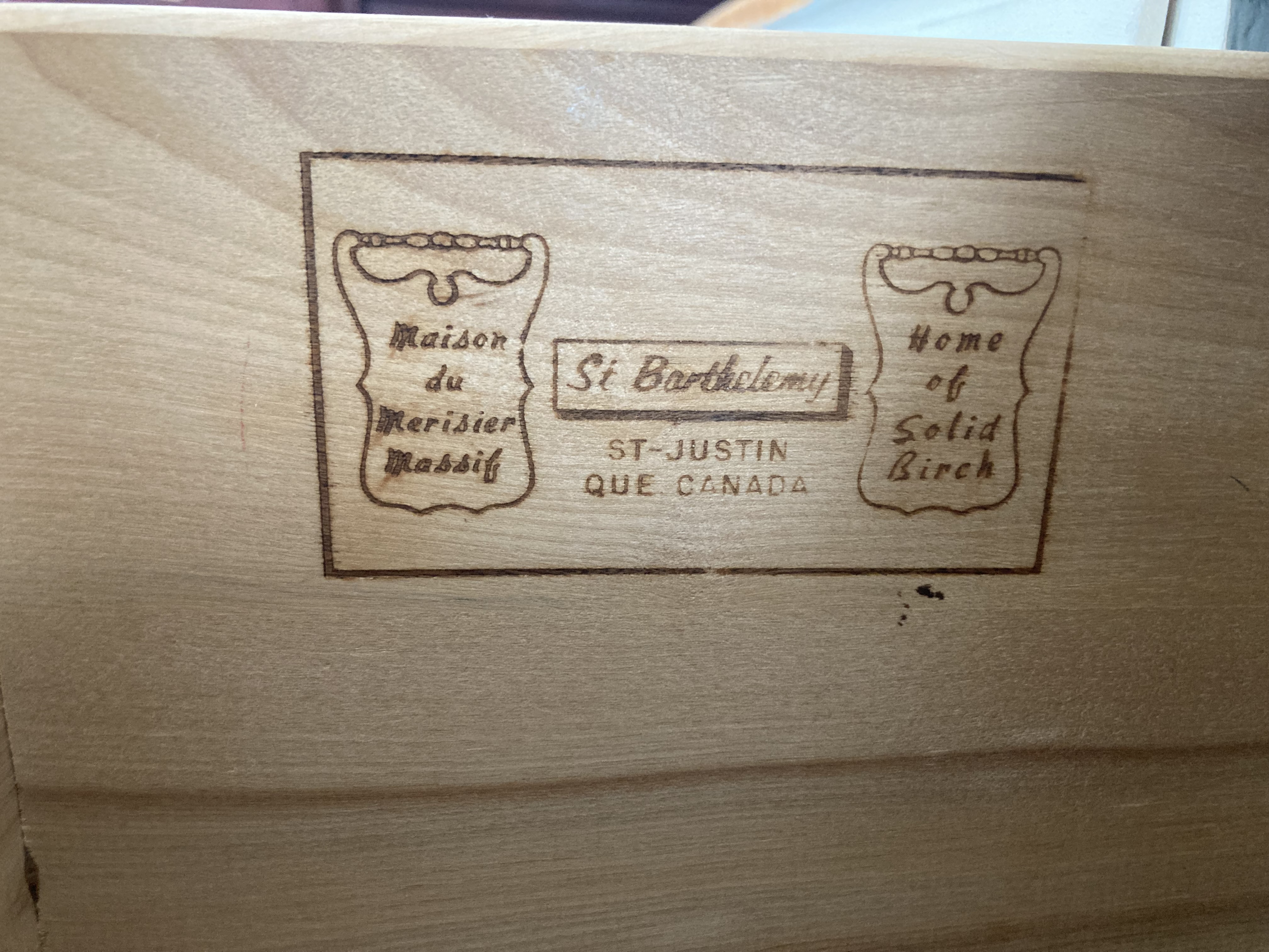 A stunning example of mid-century Quebec craftsmanship, this vintage 1970s six-drawer dresser by the renowned St-Barthélemy furniture makers stands as a testament to timeless beauty and expert construction. Made from cherry wood, the dresser’s natural, unpolished grain is left raw, offering a warm, earthy tone that only mineral oil—gently applied—seals, preserving its authenticity and character.