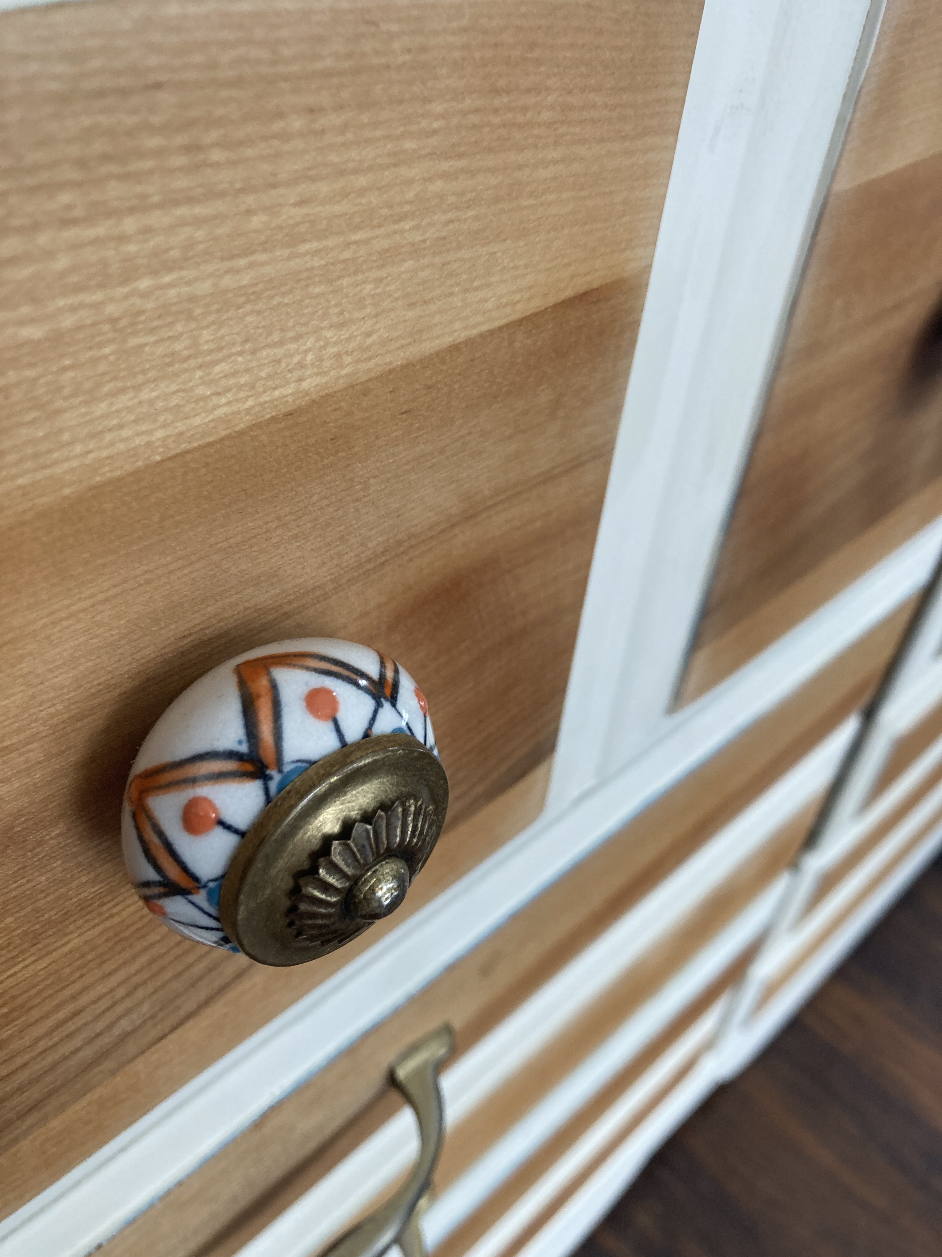 The dresser is completed with colorful enamel hardware, offering an unexpected burst of vibrancy that reflects the playful spirit of the 1970s, yet in a refined and tasteful manner. Each pull and knob, painted in bright, complementary hues, provides a charming contrast to the muted tones of the cherry wood and the soft, creamy finish, evoking a sense of joyful nostalgia for an era where craftsmanship and style effortlessly coexisted.