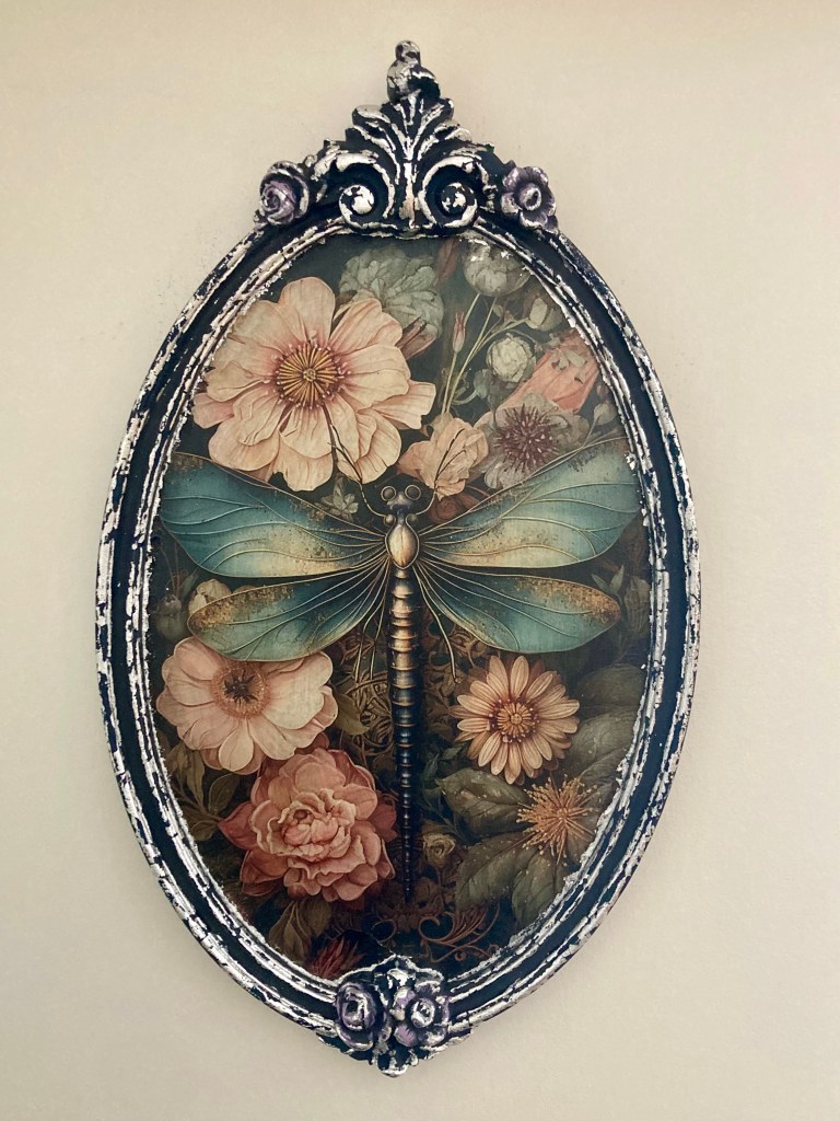 A dragonfly sits at the heart of it, a quiet omen, a reminder that change is inevitable—whether you like it or not. The frame, drenched in silver foil, catches the light like a smirk in a dimly lit room. This isn’t a mirror anymore. It doesn’t reflect you. It sees you. And it has thoughts.