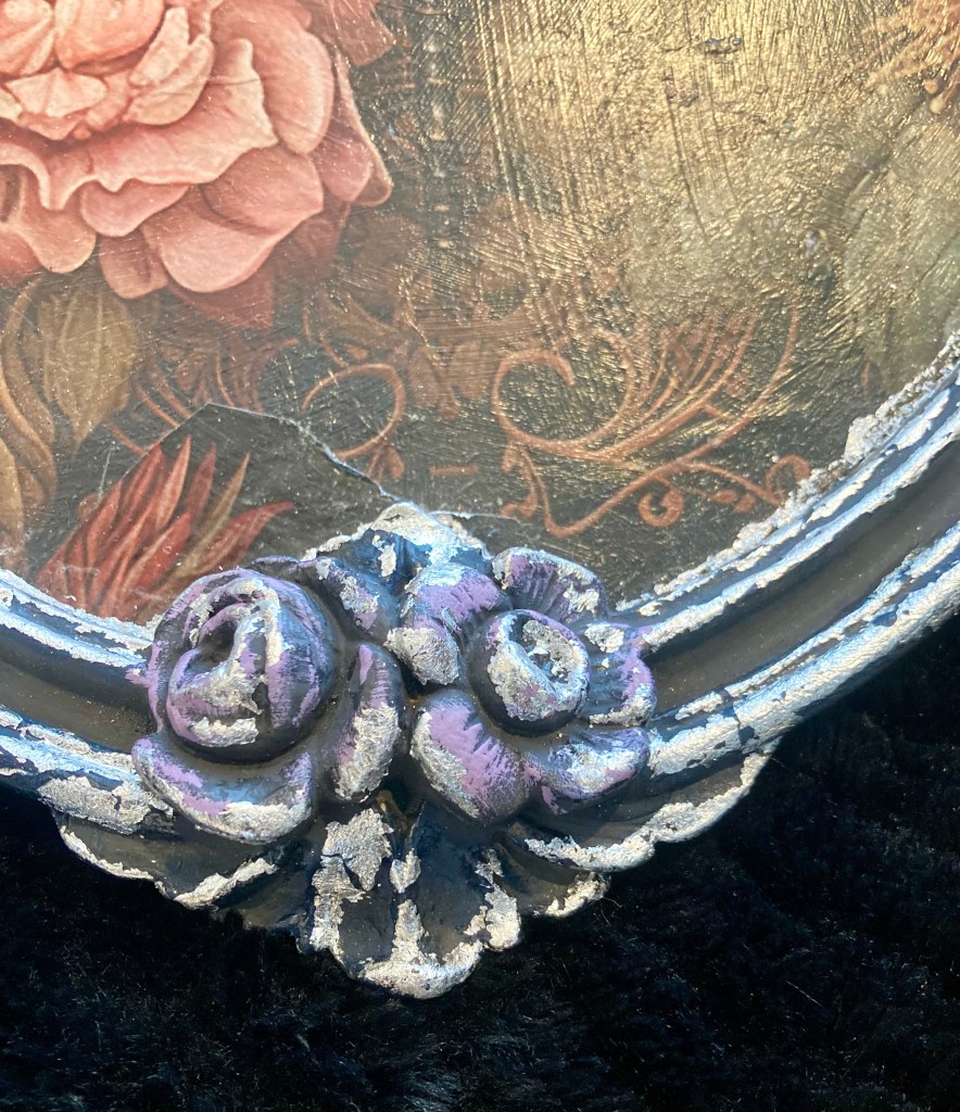 Once, this was just an old mirror—probably hung in some grand house, watching centuries of bad decisions unfold. Now? It’s something else entirely. The glass is gone, swallowed by shadow and color. Silver, blue, and black bleed together, with just enough soft pink to make you wonder if it’s comforting or mocking you.
