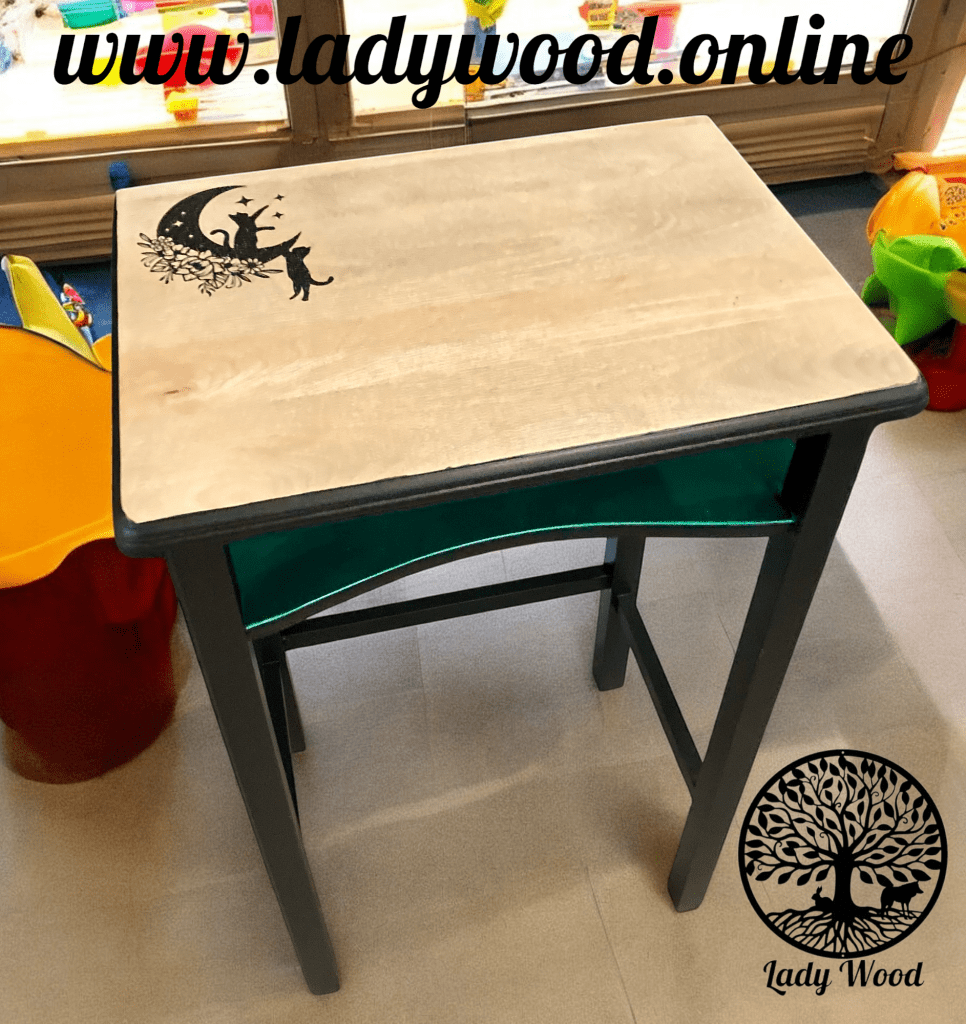 At the center, two sparkling kittens frolic on a crescent moon, capturing the spirit of nighttime adventures. This desk is not just a workspace; it’s a portal for little dreamers ready to unleash their creativity under the gaze of their celestial companions.